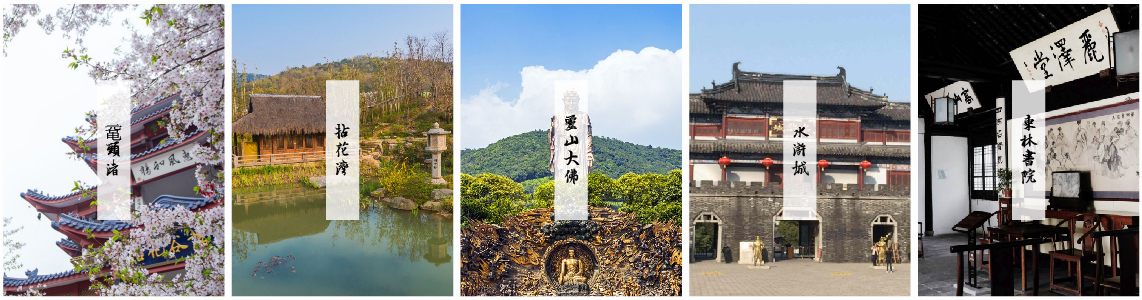 黿頭渚、拈花灣、靈山大佛、蠡園、錫惠公園、惠山古鎮、三國城、南禪寺、中視無錫影視基地、梅園、蕩口古鎮、清名橋古運河景區、水滸城、崇安寺景區、東林書院、靈山勝境、宜興竹海、靈谷洞、張公洞、善卷洞、陶祖圣境...